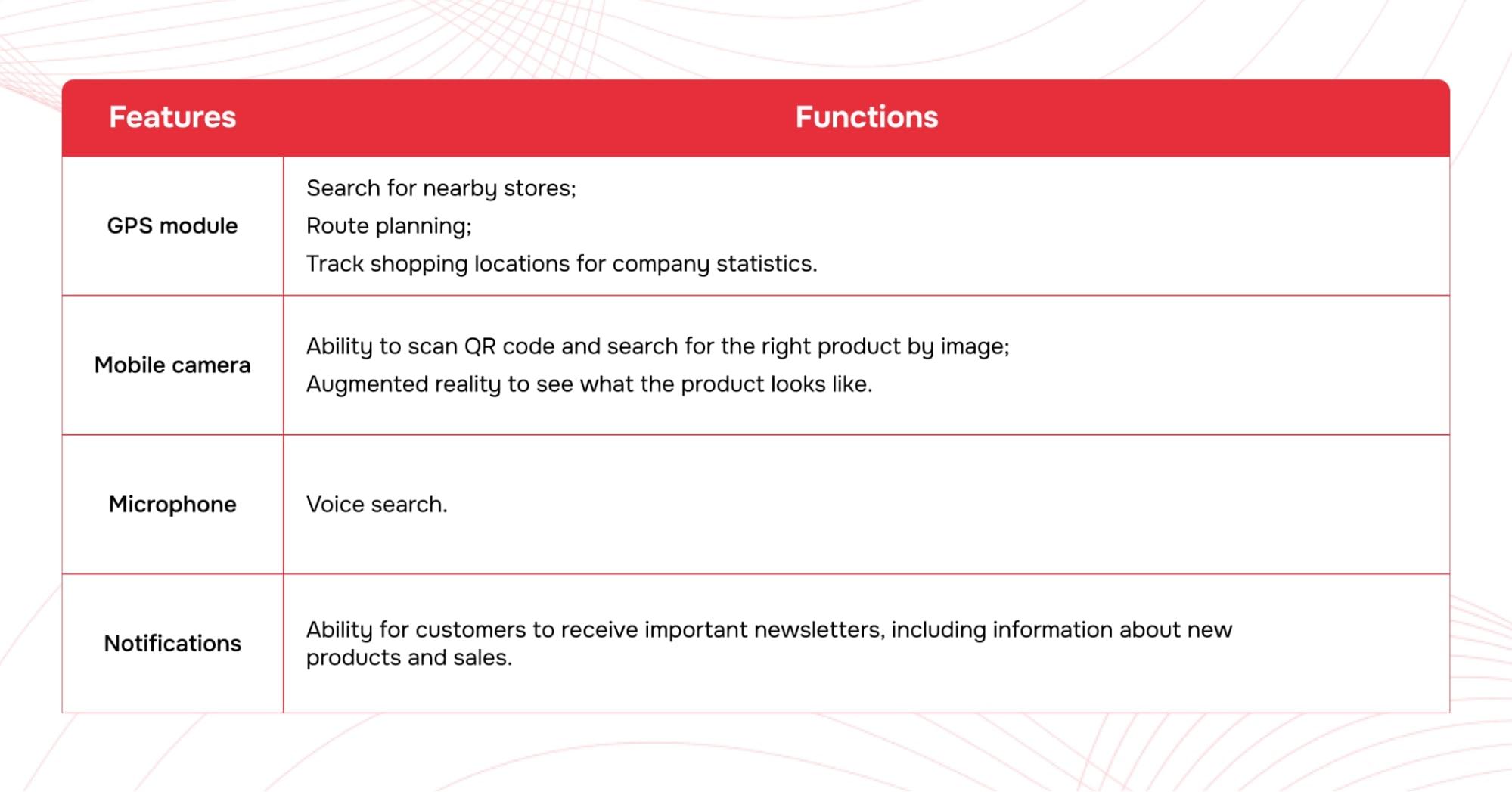 A separate point we should highlight is eCommerce mobile app features. Due to the fact that modern smartphones and tablets have advanced functionality, different features can be added to mobile apps.