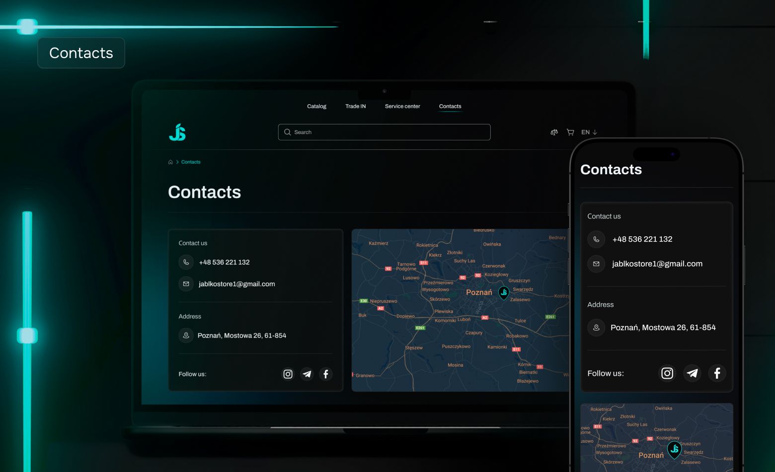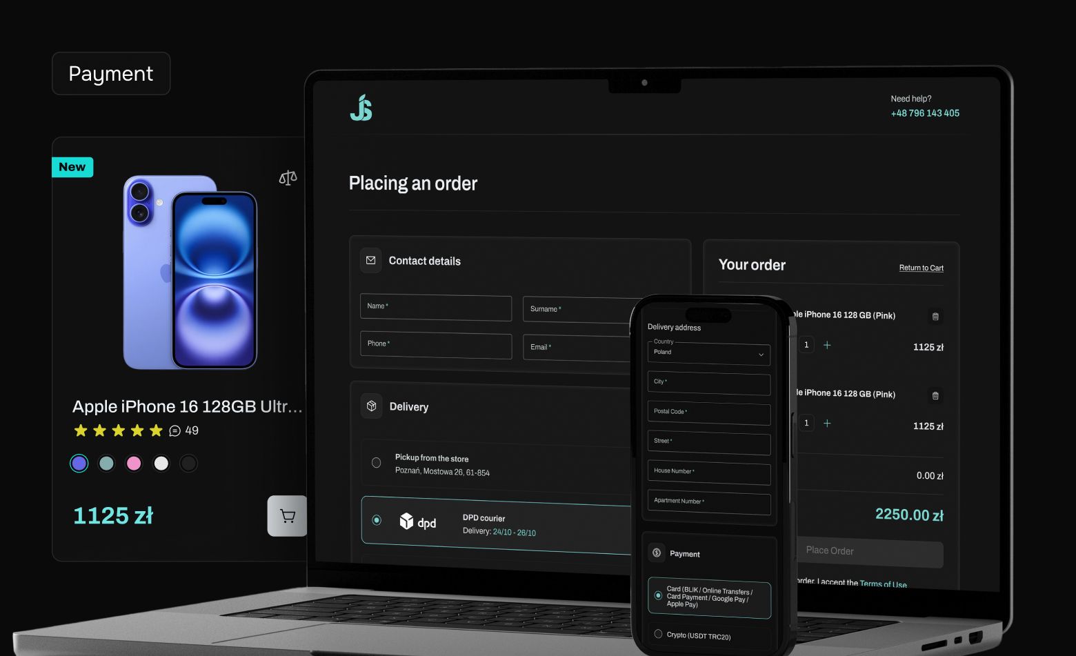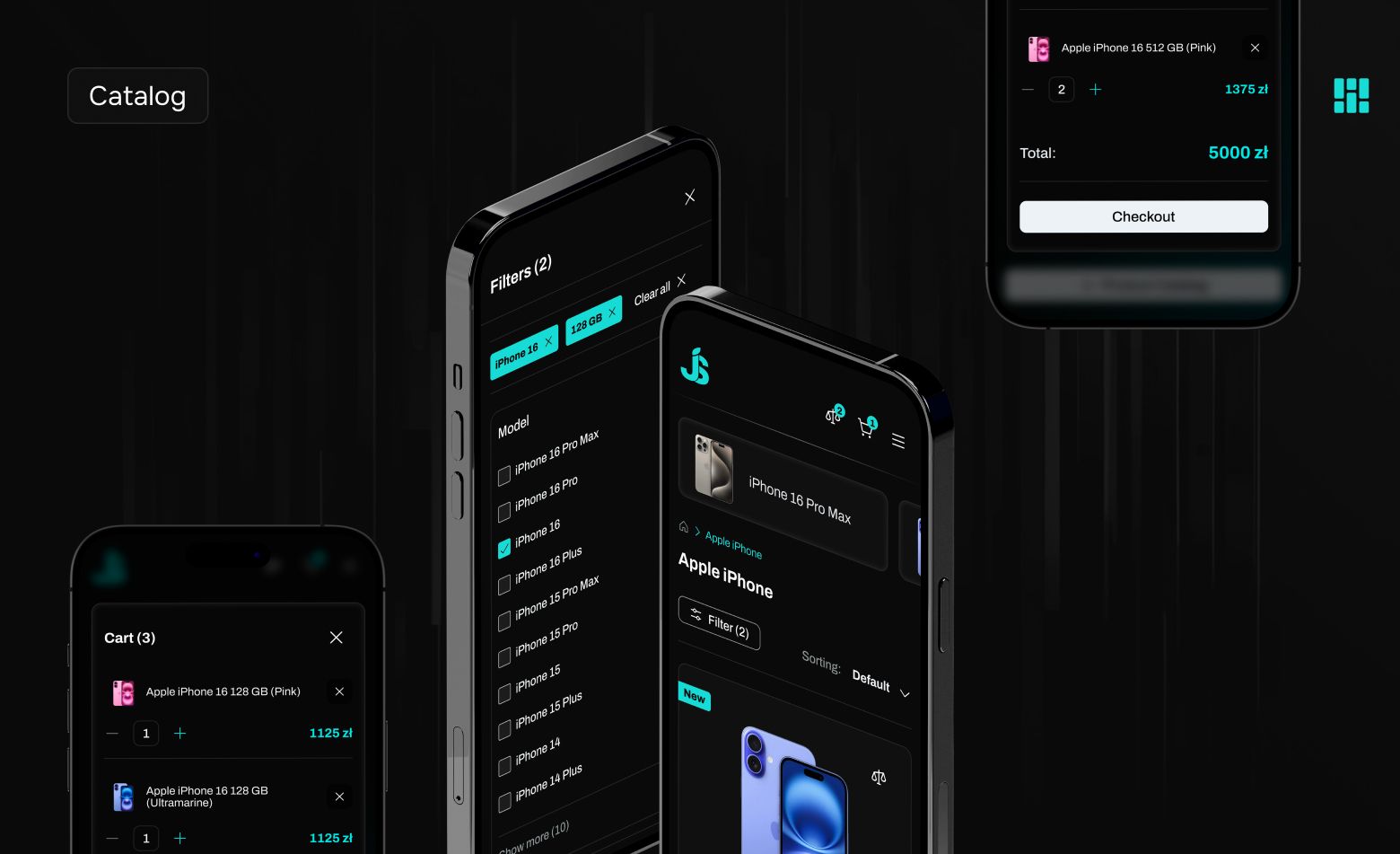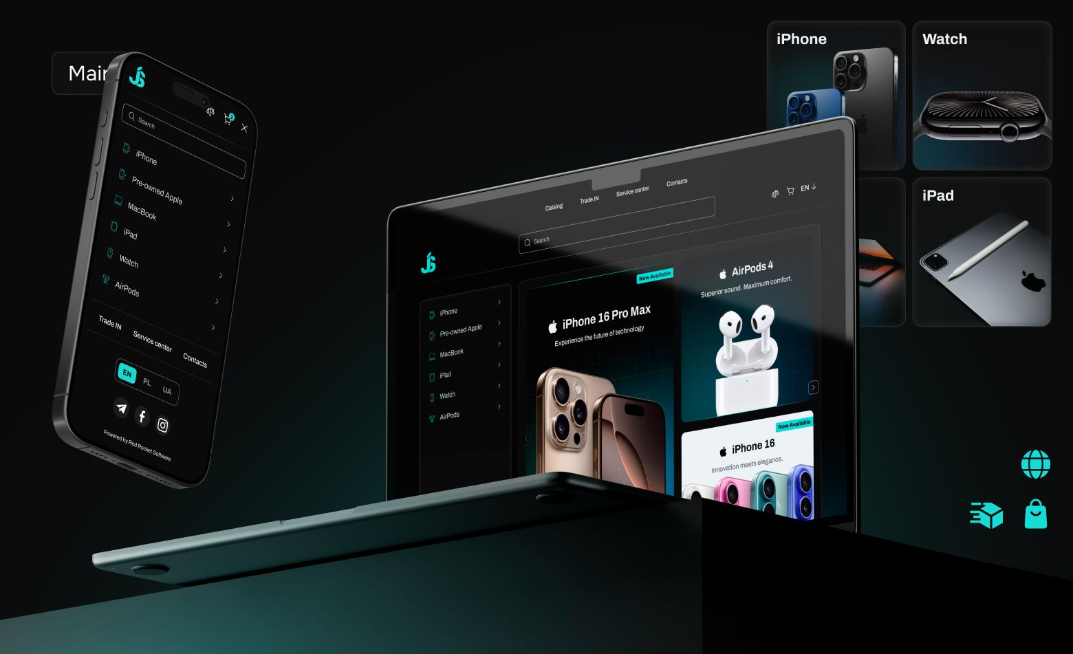 Our team developed a comprehensive visual design. We created amodern dark color schemewith bright turquoise accents, providing a strong visual impact and recognizable branding. The design is fully adapted for devices from smartphones to tablets and desktop versions. For the main page, we designed an intuitive interface with an effective placement of product cards, a navigation menu and product categories.