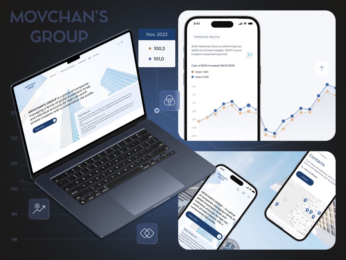 The client wanted us to completely redesign their website and help with a new brand style for Movchan’s Group. They wanted to make their investment services more accessible to affluent customers, and create a better experience for analyzing investment data.